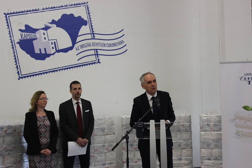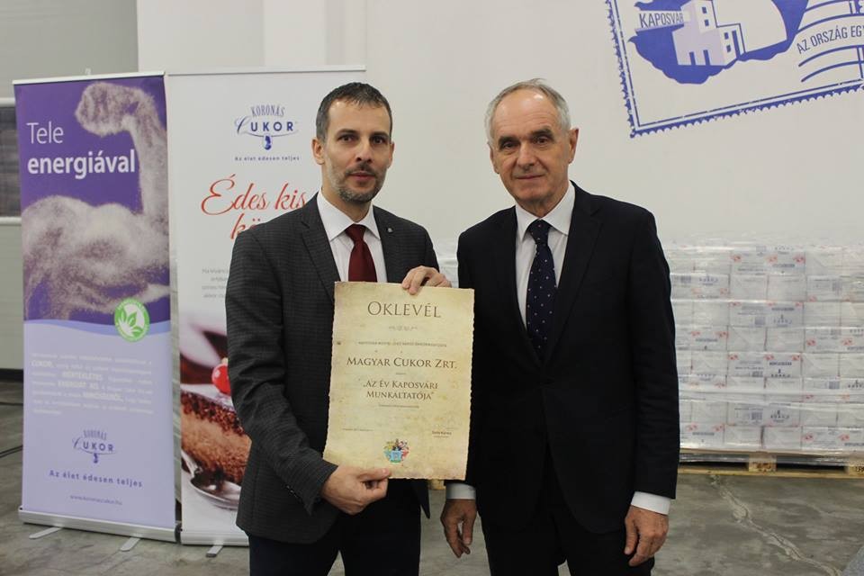 Szita Károly, Kaposvár polgármestere ma adta át az év munkáltatója elismerést a vállalkozásnak. Köszöntőjében elmondta: a cukorgyár hosszú évek óta biztos megélhetést kínál a dolgozóinak, erősíti a város gazdaságát, a befizetett adóforintjait pedig közjóra, közcélokra lehet fordítani.