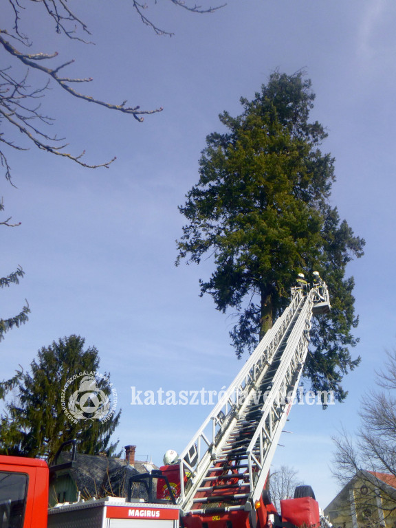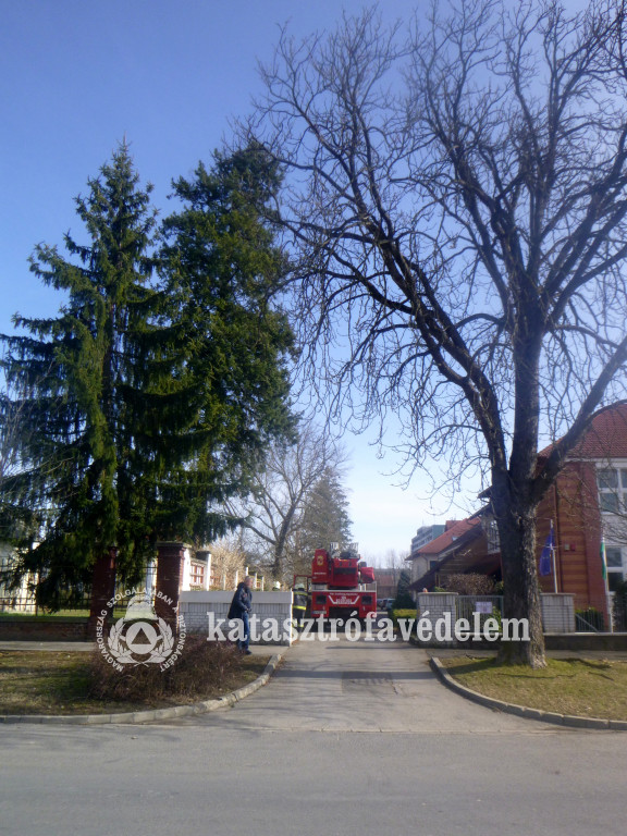 A gimnázium épülete felé dőlő fa veszélyeztette az intézmény diákjainak és dolgozóinak testi épségét. A város hivatásos tűzoltói magasból mentő segítségével, motorfűrésszel legallyazták és eltávolították a veszélyes fenyőfát.